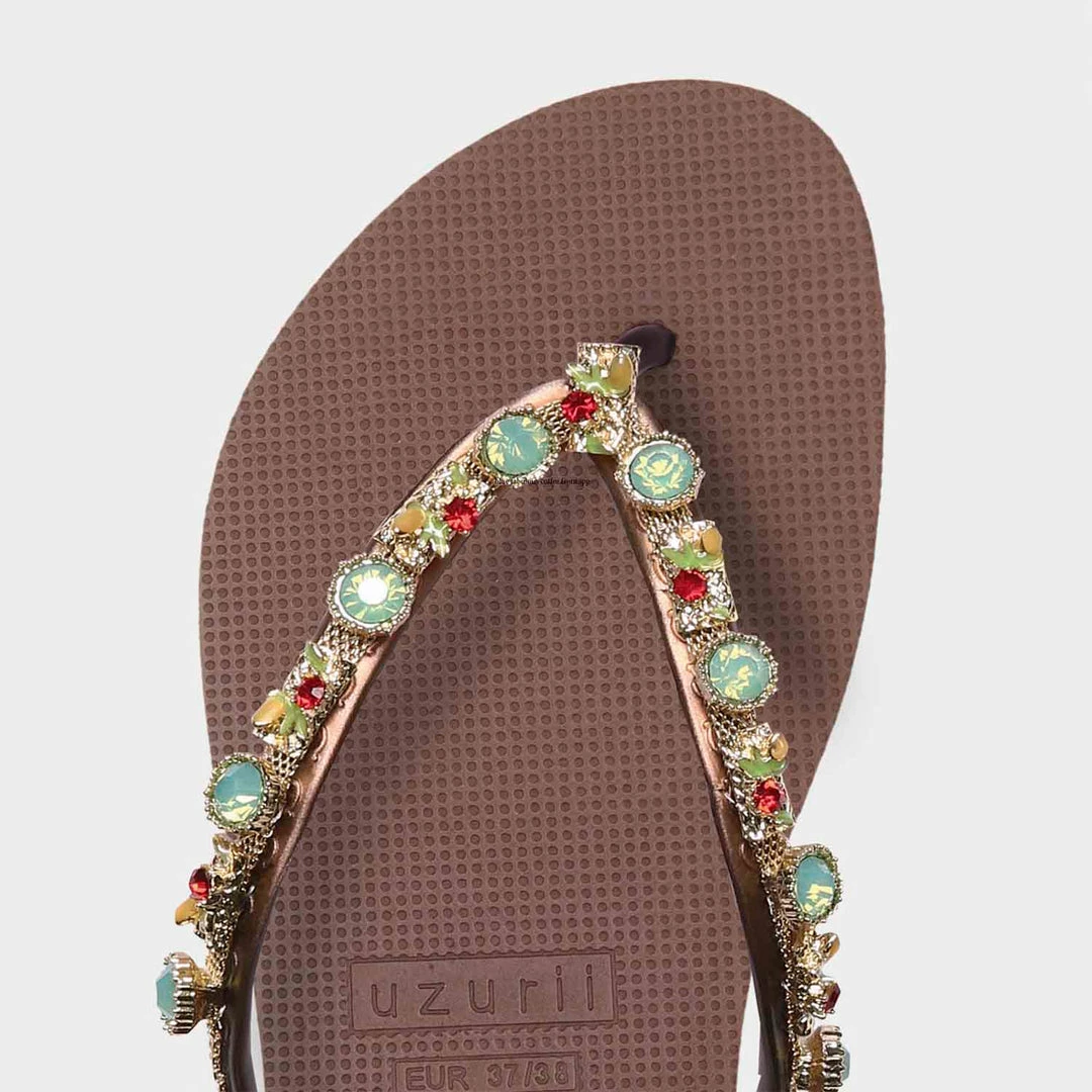 Playing with tiny stones and fun colors makes this particular design extra cute and feminine. Many details are implemented in the stones, which tells a story about your own individual dream. Definitely an eye-catcher. The V are detailed with the signature Uzurii logo across the straps. Featuring an open toe, a slip-on style and a flat rubber sole.