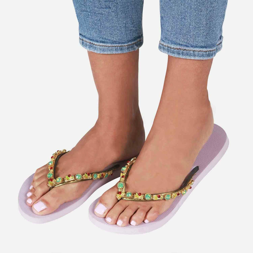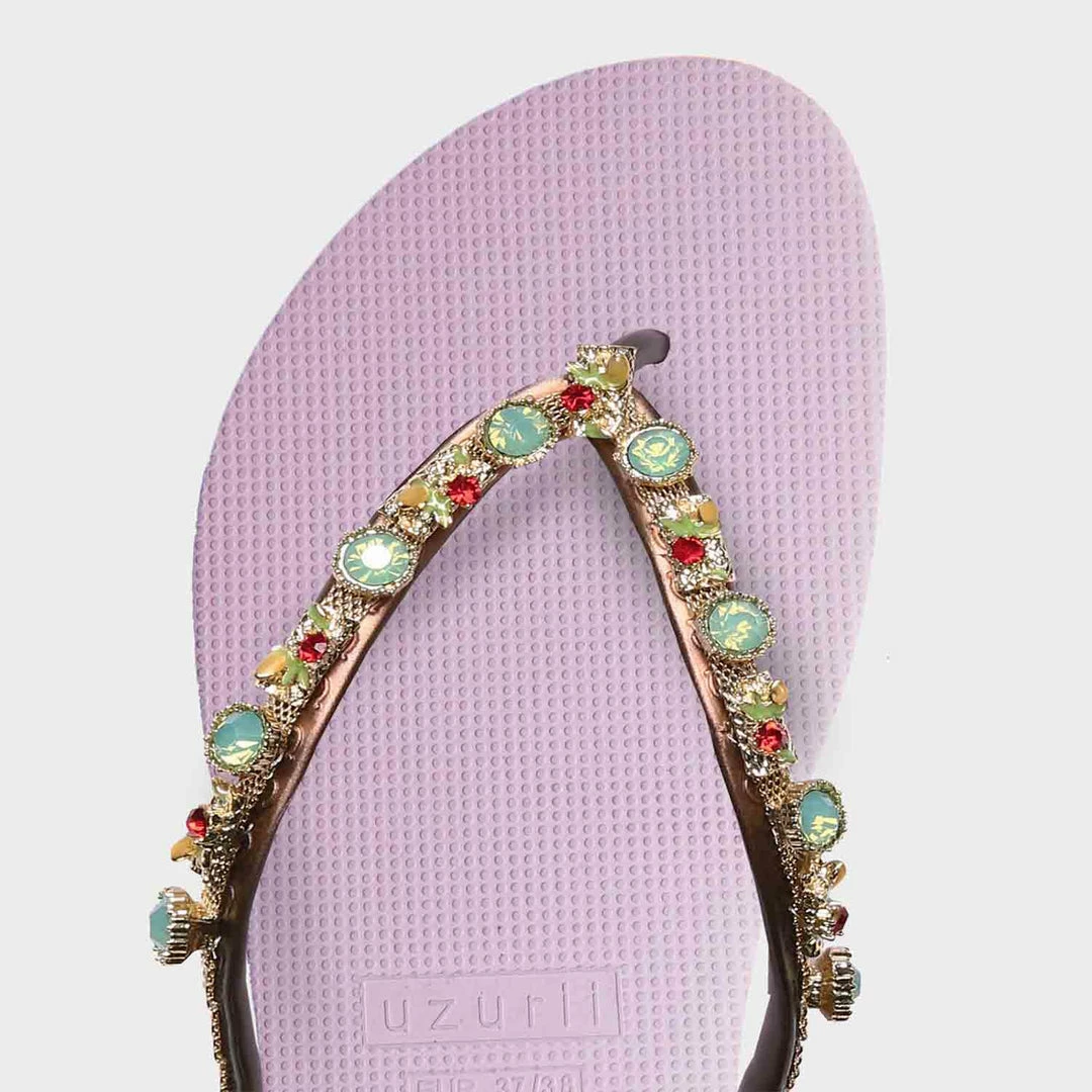 Playing with tiny stones and fun colors makes this particular design extra cute and feminine. Many details are implemented in the stones, which tells a story about your own individual dream. Definitely an eye-catcher. The V are detailed with the signature Uzurii logo across the straps. Featuring an open toe, a slip-on style and a flat rubber sole.