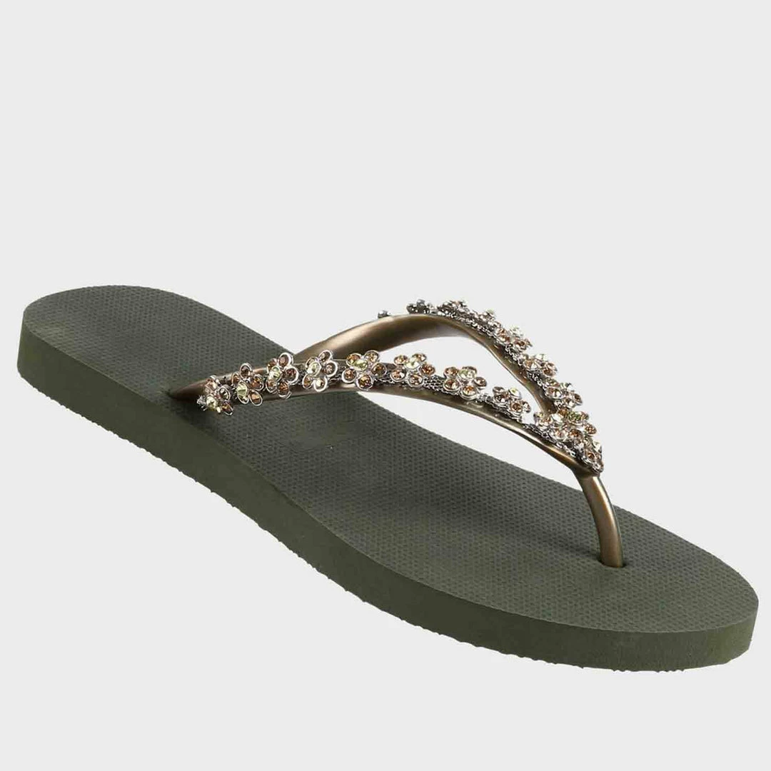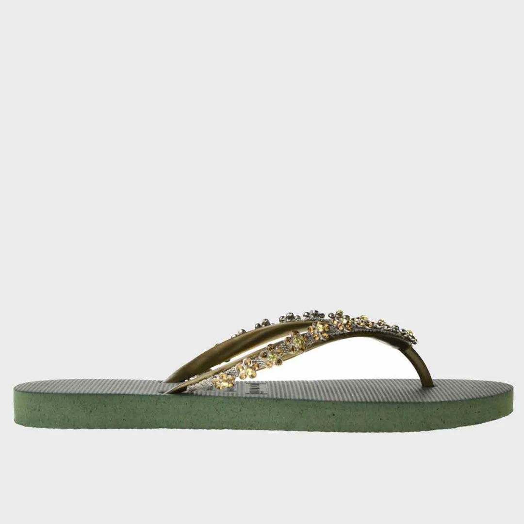 UZURII FLOWER POWER GOLD ARMY GREEN FLIP FLOP