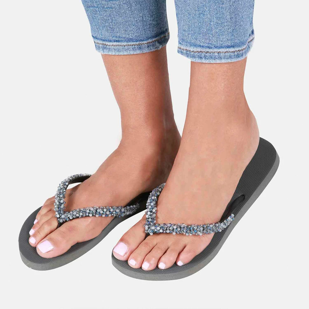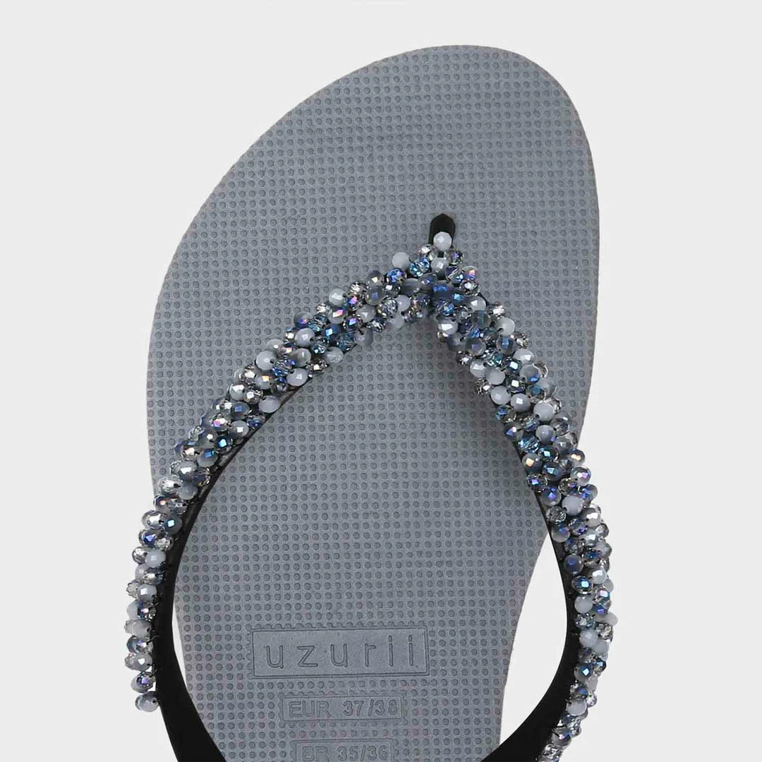 A timeless design that will never go out of style. This variant come in many color options. The Precious Classic is the perfect balance between over-the-top and minimalism. The V are detailed with the signature Uzurii logo across the straps. Featuring an open toe, a slip-on style and a flat rubber sole.