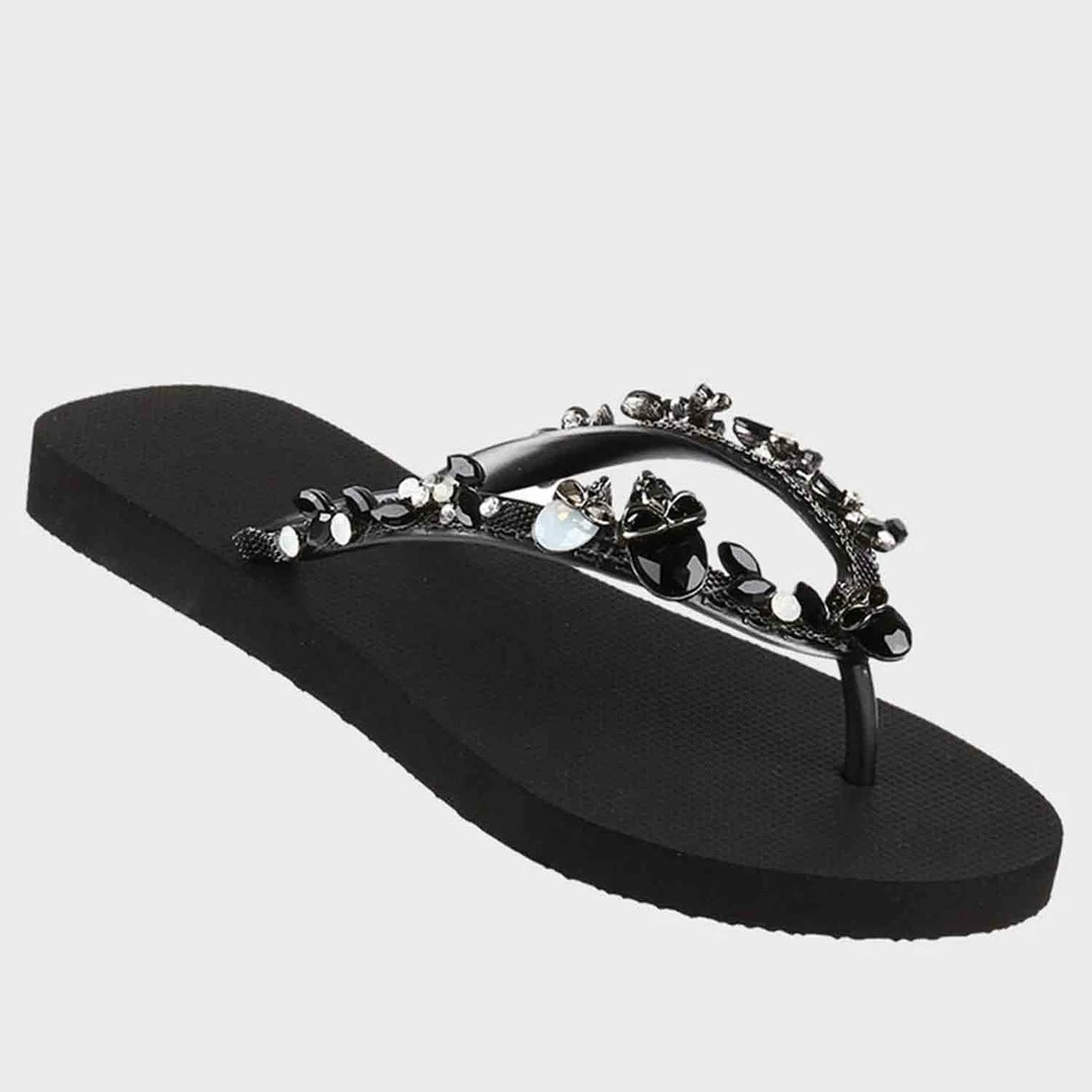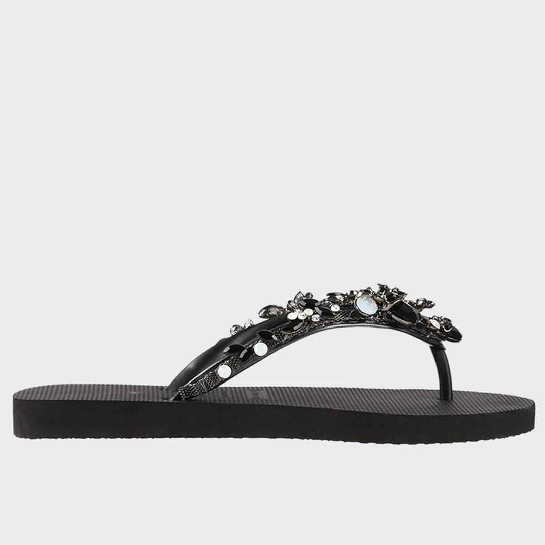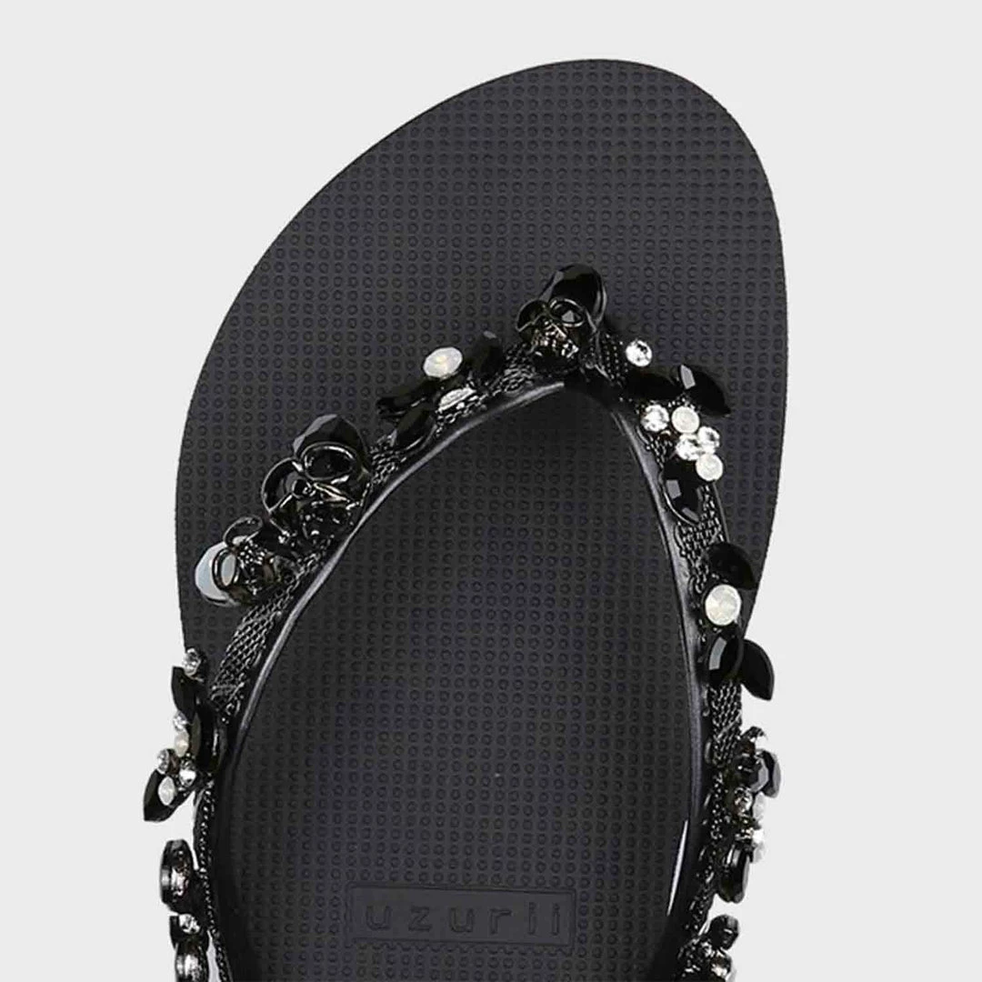 A stunning limited edition sandal from luxury footwear designer Uzurii. Featuring a dazzling band of eye-catching diamante beading, this sandal is ideal for holiday wear. A stylish and luxurious approach to a familiar sandal.